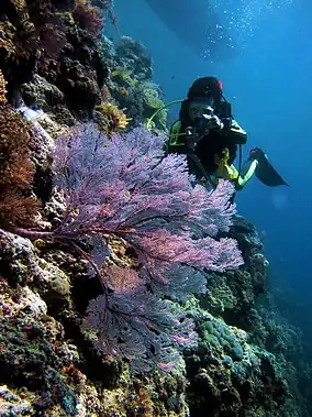 The atoll is of major ecological importance, with rich marine and bird life.[7] The national park is considered to contain some of the world's highest marine biodiversity.[11] According to the Indonesian Department of Forestry the atoll has 261 species of coral, 295 species of coral fish, 244 species of mollusc and other species such as hawksbill turtle (Eretmochelys imbricata), Pacific ridley turtle (Lepidochelys olivacea), and green turtle (Chelonia mydas).[1]