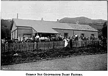 At the time of French settlement in August 1840 in Akaroa, a small number of German families settled in this bay.[4] Five German men, four of them single, chose to have land in Takamatua rather than Akaroa. The men were Breitmeyer, Hahn, Hettich, Waeckerle, Walther and Woll. [5] The bay was named German Bay up until 1916 when the residents called on the Minister for Internal Affairs, George Warren Russell, to change the name to Takamatua, as a patriotic reaction to World War I.[6] The German Bay Dairy Co-operative Factory was established in 1893.[7] The Factory's cheese won first prize at the Dunedin Agricultural Show in 1901 and 1902.[7][8]