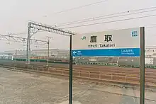 Takatori Station (鷹取駅, Takatori Eki) is a railway station on the JR West San'yō Main Line (JR Kobe Line) in Suma-ku, Kobe, Hyōgo Prefecture, Japan. Only local trains stop at Takatori Station. The station has an unusual layout. It has one island platform serving two tracks, and additional tracks on the northern side for Special Rapid Service (新快速, Shin-Kaisoku), express trains and freight trains. While the Akashi-bound express track is immediately adjacent to the station and is viewable from the platform, the Kobe-bound express track is separated from the platform by a local track, the aforementioned express track, a series of additional tracks and an active freight-related loading area. As a result, the Kobe-bound express track is located roughly 60 meters north of the island platform and is usually not in full view from the platform.