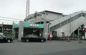 The station has two opposed side platforms serving two tracks, with an elevated station building above the tracks and platforms.