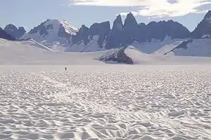 Taku Glacier (Lingít: T'aaḵú Ḵwáan Sít'i) is a tidewater glacier located in Taku Inlet in the U.S. state of Alaska, just southeast of the city of Juneau. Recognized as the deepest and thickest alpine temperate glacier known in the world, the Taku Glacier is measured at 4,845 feet (1,477 m) thick.[2] It is about 58 kilometres (36 mi) long, and is largely within the Tongass National Forest.