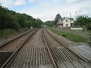 Talerddig railway station was a station in Talerddig, Powys, Wales. The station opened in 1900 and closed on 14 June 1965, one of many on the line abandoned as a result of the Beeching Axe.[1] The signal box predated the station, being built by McKenzie and Holland in 1874.[1] The old Station Master's house now forms part of a private residence.[2] The station was demolished shortly after closure. There is still a much-used passing loop on the Cambrian Line here, though this is now supervised from the signalling centre at Machynlleth and the points work automatically.