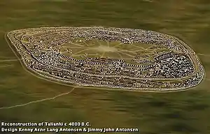 48°48′18″N 30°32′06″E / 48.80500°N 30.53500°E Talianki or Talianky (Ukrainian: Тальянки́) is an archaeological site near the village of the same name in Cherkasy Oblast, Ukraine. It was the location of a large Cucuteni-Trypillian settlement dating to around 3850–3700 BC, currently the largest known settlement in Neolithic Europe.[1][2] The settlement, built on a bluff between the Talianka River and a smaller stream, was made up of ovular, concentric rows of interconnected buildings.[3] Built on top of the older Cucuteni-Trypillian settlement are the remains of some Yamnaya culture tumuli (burial mounds) dating to the middle of the 3rd millennium BC, as well as some graves from the late Bronze Age.[3]