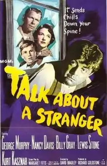 Talk About a Stranger is a 1952 American film noir directed by David Bradley and starring George Murphy, Nancy Davis and Billy Gray. The motion picture was shot by noted cinematographer John Alton, A.S.C. and was based on Charlotte Armstrong's short story "The Enemy", which was published in the May 1951 issue of Ellery Queen's Mystery Magazine and was subsequently chosen for the top prize in the Mystery Magazine's yearly selection of best stories.[2]