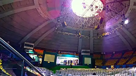 The stadium has one competition ring and four warm-up areas. The stadium has a tunnel to facilitate movement of the athletes from the Facility Block to the main stadium. The stadium has been connected to a tunnel which is used by the athletes, it has multiple facilities which include acoustic ceiling of dome, scoreboard, video screens and sports lighting. A number of environment-friendly material and energy-efficient devices have been used in this block to make it a green building.