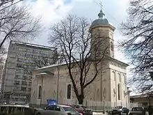 In July 1827, a devastating fire completely destroyed the church. A descendant of the original founders, vornic Dimitrie Cantacuzino-Pașcanu, rebuilt the structure.[1] He and his wife Pulcheria are depicted in an oil painting, holding the church.[2] During the period, Metropolitan Veniamin Costache, himself related to the Cantacuzenes, was preoccupied by the church's well-being. By 1835, reconstruction was complete, and a liturgy was celebrated in the new building for the opening of the nearby Academia Mihăileană. Subsequently, the church would serve as a chapel for the school. The church was practically ruined by 1884, when renovations took place,[1] lasting until 1890.[2] The walls were repaired, the walls and ceilings painted in oil, the iconostasis gilt, the balcony, doors and windows redone. The bell tower was also rebuilt, and two pavilions added to the south side of the church: one at the entrance, the other near the altar, above the crypt which contains the graves of benefactors.[1]