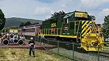 RBMN 2014, an EMD GP38-2, stopping with an excursion train at the station on June 18, 2023. The platform extension was built in 2020 to serve excursion trains stopping at the station.