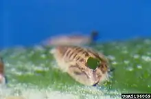 Tamarixia radiata is an idiobiont ectoparasitoid of Diaphorina citri.[6] The female wasp lays one or occasionally two eggs on the underside of a nymph of its host, between the third pair of legs.[6] Even if two eggs are laid beneath a nymph only one adult wasp will result so T. radiata is a solitary parasitoid. One adult female T. radiata can lay up to 300 eggs in her life. On hatching the larvae attach themselves to the host and begin to feed on its haemolymph which eventually results in the death of the host. The newly hatched larvae are about 0.28mm long and 0.11mm wide, they go through four instars and reach .14 mm long and 0.59 mm wide in their fourth instar.[3] In the later stages of its growth the larval T. radiata will have totally excavated the body cavity of the host nymph.[8] The nymph's body turns a dark brown colour and becomes "mummified".[9] The T radiata pupa extrudes silk which is used to adhere the excavated host's body to the twig where the nymph was feeding and sometimes the silk can be seen around a nymph with a T. radiata pupa within[8] The larvae then pupates within the remains of the host and the adult wasp emerges through a hole, visible to the naked eye, in the nymph's thorax or head. The wasps will parasitise any age of host nymph but prefer the fifth instar nymphs. Under laboratory conditions, the development time from oviposition to the emergence of the adult from the host can take 11.4 days.[3]