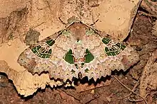 The green patches on a variegated and fasciated grey ground distinguish this species from other congeners.