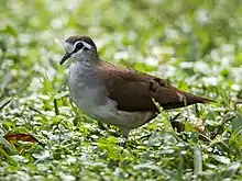 The tambourine dove's flight is fast and agile, and it tends to stay quite low when flushed. In flight it shows chestnut primary flight feathers and under wings.
