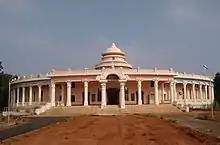 The university is situated in a campus of about 900 acres (3.6 km2), granted by the State government of Tamil Nadu, making it the largest university in the state by area. Buildings and blocks for the administrative and academic departments are located in the campus. The administrative block with its gopuram motif can be seen from the National Highway connecting Thanjavur with Trichy. The library is reminiscent of the Indian Parliament at New Delhi.[1] The Karikalan Gallery, built on the occasion of the World Tamil Conference is capable of accommodating about 2000 people.[2]