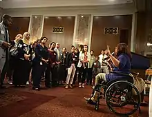 During the 115th Congress, Duckworth was credited with saving the Americans with Disabilities Act.[86] Specifically, she led public opposition to a controversial bill, H.R. 620,[87] and led 42 senators in pledging to oppose any effort to pass H.R. 620 through the Senate.[88] The Veterans Service Organization and Paralyzed Veterans of America recognized Duckworth's leadership in defending the Americans with Disabilities Act.[89]