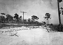 In Dade City, Mt. Zion Baptist Church was demolished, which was never rebuilt. Only the church cemetery remains.[34] Another church, which opened early in the year, was nearly demolished by falling trees. A turpentine plant was damaged, including the loss of about one-third of the lumber stored in the building. The Sunnybrook Tobacco Company suffered significant impact, with nine large barns destroyed and about 110 acres (45 ha) of trees toppled. A number of other companies sustained damage, including the Dade City Packing Company and the Dade City Ice, Light and Power Company. Damage to the business reached $100,000. Several homes were damaged. Electrical, telegraph, and telephone wires were downed throughout the city. During the storm, electricity was maintained in the downtown section, while residential areas were left without power for two days. In San Antonio and Trilby, a number of buildings were moved off their foundations. The old city hall in Zephyrhills was moved about 4 ft (1.2 m). At a hotel, the building lost a portion of its roof and several windows were broken.[35] In addition, the hurricane virtually destroyed much of Passage Key, part of which was later rebuilt.[36]