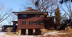 Tan-y-Deri, is also known as the Andrew T. Porter Home and the Jane and Andrew Porter Home. Jane Porter (1869-1953) was the sister of architect Frank Lloyd Wright. The home was commissioned from Wright in 1907, with Jane and Andrew Porter (1858-1948) moving in with their children James (1901-1912) and Anna (1905-1934) by late January 1908.[1] The home stands in a valley in the town of Wyoming, Wisconsin (near the village of Spring Green). This valley was originally settled by the Lloyd Joneses, who were the family of Wright and his sister's mother.[2] The Lloyd Joneses were originally from Wales and, as a result of this heritage, Wright chose a Welsh name for the Porter home: “Tan-y-deri” is Welsh for “Under the oaks”.[3]