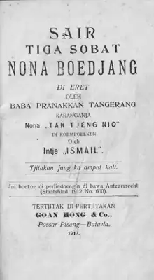 In the 1897 a book of her poetry, written in the Syair form, was printed by Albrecht & Co. in Batavia.[1][2] It was titled Boekoe sair tiga sobat nona boedjang dieret oleh baba peranakan Tangerang, sahingga sampe djadi abis-abisan, di koempoelken oleh Intje Ismail (Poem about three women friends, one of whom was seduced by a Peranakan man from Tangerang until she was bankrupt, compiled by Intje Ismail).[3][4] In the poems, the female protagonists (named A, B, and C) come to realize that it as better to have control of their own lives even if they lived in poverty, and that celibacy may be preferable to marriage.[5][3][4][6] More broadly, it served as a warning to young Chinese women to think twice about marrying men who went through the motions of romantic love in order to trick naïve women out of their money; the contemporary advertisement by the publisher marketed it as such and praised its "good Malay".[7][8] The poems also display many forms of physical intimacy between the three female protagonists, as well as a level of independence from their parents that is quite different from other Indonesian Chinese literature of the era.[6][9]