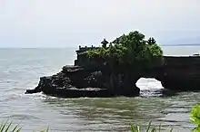 Tanah Lot (Balinese: ᬢᬦᬄᬮᭀᬢ᭄) is a rock formation off the Indonesian island of Bali. It is home to the ancient Hindu pilgrimage temple Pura Tanah Lot (literally "Tanah Lot temple"), a popular tourist and cultural icon for photography.[1]