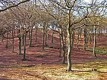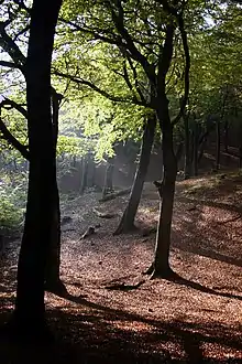Tandle Hill was originally part of the township of Thornham - part of the extensive parish of Middleton. It was used as a meeting place for radicals in the 19th century. In the period leading up to the Peterloo massacre it was said that it had been used by radicals for practising marching and drilling. The beech woodland was planted to prevent this happening again and the hill became a hunting park and private game reserve as part of the Thornham Estate.[1] It was sold in 1861 and came into the ownership of Joseph Milne, whose wife later sold the park to Norris Bradbury, a Royton councillor. Bradbury gifted the park to the people of Royton in 1919 as a peace offering at the end of the First World War. A granite marker stands near the Oozewood entrance to the park, and its inscription reads:
