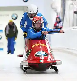 Vicenzino (red helmet) driving her bobsled at the IBSF World Championships 2020.