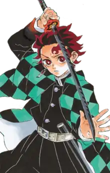 Tanjiro Kamado originates from Koyoharu Gotouge's ideas involving a one-shot with Japanese motifs. Tatsuhiko Katayama, their editor, was worried about the one-shot crusade being too dark for the young demographic and asked Gotouge if they could write another type of the main character who would be "brighter".[4] Gotouge has cited issues in the making of the character due to the contrast he has with the dark narrative. For the release of the manga's seventh chapter, Gotouge drew a cover of Tanjiro wielding his sword while smiling. However, due to the contrasting aesthetics the manga had, they discarded the drawing and instead drew a similar design with Tanjiro having a serious expression.[5]