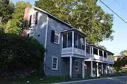 Tankersley Tavern, also known as Old Bridge, is a historic building located near Lexington, Rockbridge County, Virginia. It was built in three sections with the oldest dated to about 1835. It is a two-story, nine-bay, single pile, frame building with an exposed basement and a decorative two-level gallery on the front facade. Also on the property are the contributing washhouse/kitchen, three frame sheds and a stone abutment for a bridge. It was originally built as a toll house (toll gate) at the county end of the bridge crossing the Maury River from the Valley Turnpike into Lexington. It later housed a tavern, canal ticket office, general store, post office, and dwelling.[3]