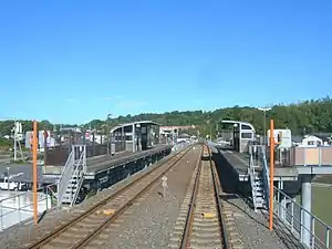 The station consists of two opposed side platforms serving two elevated tracks. There is no station building but both platforms have shelters for waiting passengers. Access to the each platform is by separate flights of steps. Another shelter and a bike shed have been built near the base of the steps.[2][3][5]