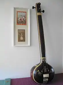 The tanpura (Sanskrit: तंबूरा, romanized: Taṃbūrā) (also referred to as tambura, tanpuri, tamboura, or tanpoura) is a long-necked, plucked, four-stringed instrument originating in India, found in various forms in Indian music.[1] Visually, the tanpura resembles a simplified sitar or similar lute-like instrument, and is likewise crafted out of a gourd or pumpkin.