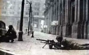 At the Ministry, a tank made its way to the main entrance, climbed the steps into the building, and started firing on offices. Sergeant Rafael Veillena, of the Army's Second Division, was killed when he looked out a ninth-floor window. The firing of machine guns and tanks panicked workers in the area, who at that hour were making their way to their jobs downtown. A woman working at the State Bank near the Ministry was killed, as well as a couple who were caught in cross-fire. At least 16 people were wounded, four seriously.[1] A group of foreign journalists covering the reforms carried out by Allende's government was caught in the middle of the insurrection. While filming the events outside La Moneda, Argentine cameraman Leonardo Henrichsen and his colleague Jan Sandquist were fired at by corporal Héctor Hernán Bustamante Gómez and several soldiers. Henrichsen was fatally shot by a soldier, who was never identified. Before collapsing in the arms of Sandquist, Henrichsen recorded the military foot patrol firing at him. The footage was recovered by Sandquist and shown on Argentine television on 24 July.[2]