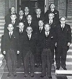 Ishibashi's cabinet (Ishibashi is in the centre, with Nobusuke Kishi to his left, as his Minister for Foreign Affairs, and Hayato Ikeda to his right as his Minister of Finance).