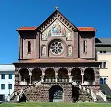 The Neo-Romanesque, three-nave basilica with an apse was built in the first two decades of the twentieth century according to plans by Hans Pascher in collaboration with the architect Father Johann Maria Reiter[2] and Eduard Avian,[3] but it was not completed. The final construction was carried out from 1980 to 1987.