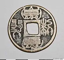 During the Song dynasty, a number of Taoist charms depicting the "Quest for Longevity" were cast. These contain images of an immortal, incense burner, crane, and a tortoise on the obverse and Taoist "magic writing" on the reverse.[2] Taoist charms containing the quest for immortality are a common motif and reproductions of this charm were commonly made after the Song period.[44] Some Taoist charms from the Qing dynasty contain images of Lü Dongbin with the inscription fú yòu dà dì (孚佑大帝, "Great Emperor of Trustworthy Protection"). This charm notably contains a round hole.[45][46]