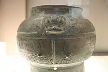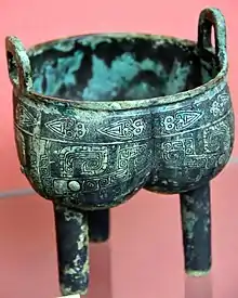 The Taotie is often represented as a motif on dings, which are Chinese ritual bronze vessels from the Shang (1766-1046 BCE) and Zhou dynasties (1046–256 BCE).[5] The design typically consists of a zoomorphic mask, described as being frontal, bilaterally symmetrical, with a pair of raised eyes and typically no lower jaw area. Some argue that the design can be traced back to jade pieces found at Neolithic sites belonging to the Liangzhu culture (3310–2250 BCE).[6] There is also notable similarity with the painted pottery shards found at Lower Xiajiadian cultural sites (2200–1600 BCE).