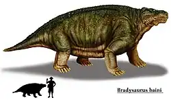 Despite the rarity of fossils, the fossil taxa that have been found from the Tapinocephalus Assemblage Zone are extremely diverse. Parareptile species such as the pareiasaur, Bradysaurus, and the perplexing putative pantestudine Eunotosaurus africanus are confined to this biozone.[27] One of the few pelycosaur species found in South African deposits, Elliotsmithia longiceps,[28] and the biarmosuchian Hipposaurus boonstrai are likewise found, including a variety of basal gorgonopsid,[29][30] anomodont,[31][32] and therocephalian species.[33] The dicynodont Diictodon feliceps first appeared in this biozone and remained ubiquitous until the Permian-Triassic boundary.[34] Other dicynodont species found include Robertia broomiana and Pristerodon brachyops. Finally, fossils of temnospondyl amphibians such as Rhinesuchus tenuceps,[35] remains of the fish Namaichthys digitata, invertebrate fossils of molluscs, invertebrate trackways and burrows, vertebrate footprints of therapsids, and a variety of plant fossils, namely of Glossopteris, Dadoxylon, and Schizoneura, have been recovered.