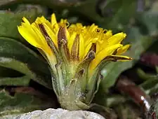 Taraxacum ceratophorum bears flowers on stems that lack leaves. The flowering stems are hairy, with simple hairs that are longer than the diameter of the stem. These hairs are white or translucent and become floccose near the inflorescence. The flowers are arranged in solitary heads, which are approximately 15 to 30 mm deep when viewed from the side and 30 to 40 mm wide. Only ligulate florets are present in the heads, and there are no pedicels. Involucral bracts are present, with 2 to 3 rows. The outer involucral bracts are predominantly dark green, lying adjacent to the flowers. They are ovate or lanceolate, tapering toward a narrow apex and measuring 5.5 to 11 mm in height and 1 to 3.5 mm in width (noticeably longer than wide and proportionately narrow). These bracts are glabrous. The inner involucral bracts are lanceolate, ranging from 12 to 20 mm in height and 2.5 to 3 mm in width. Their margins are narrow and scarious, occupying less than one-quarter of the bract, and their apices are prominently horned or callosed.[3]