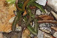 The fruit of Taraxacum ceratophorum are sessile cypselas with a persisting calyx. They are dry, obovate, and typically a pale reddish brown or brick red colour. The cypselas measure 4 to 5 mm in length and 0.9 to 1.2 mm in width, appearing glabrous and exhibiting ribbed surface venation. They are indehiscent, and the slender beak of the cypselas often exceeds the length of the body. The upper half of the cypselas' surface is spinulose. Each cypselae possesses a single seed.[3] The seeds utilize wind dispersal. The pappus of each seed helps amplify drag, which increases the chance that wind will carry it away and prolongs its descent.[4]