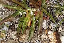 Taraxacum ceratophorum possesses a taproot. The taproot is robust, supporting the growth and stability of the plant. Additionally, the species exhibits a caudex with a diameter of approximately 5 to 10 mm. The caudex serves as a transition zone between the taproot and the basal leaves.[3]