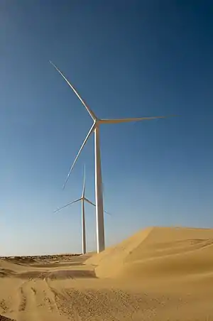 Tarfaya Wind Farm is a wind farm in Morocco, located in 20 km from Tarfaya.[1] It was developed by Tarec (Trarfaya Energy Company), a 50/50 joint venture of Nareva Holding and International Power Ltd. Tarfaya Wind Farm is owned and operated by a 50:50 joint venture between the GDF SUEZ and Nareva Holding and it is Africa's 2nd largest capacity wind farm after Lake Turkana Wind Project,[2] with 131 wind turbines, each generating 2.3 Megawatts of power, and a total installed capacity of 301 MW.[3] It was on the list of ten “Most Outstanding African Projects in 2015”, a ranking by Jeune Afrique magazine. The park was commissioned in December 2014 after two years of work and investment of 5 billion dirhams. Its constructor and operator is Tarec, which sells the power generated to the National Electricity Office. [4]