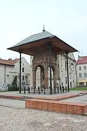 During 1941, life for the Jews of Tarnów became increasingly precarious.[16] The Germans imposed a large collective fine on the community. Jews were required to hand in their valuables. Roundups for labor became more frequent and killings became more commonplace and arbitrary. Deportations from Tarnów began in June 1942, when about 13,500 Jews were sent to the Belzec extermination camp. The first major act in the extermination of the Jews of Tarnów was the so-called "first operation" from 11–19 June 1942. The Germans gathered thousands of Jews in the Rynek (market place), and then they were tortured and killed. During this time period, on the streets of the town and in the Jewish cemetery, about 3,000 Jews were shot; in the woods of Zbylitowska Góra a few kilometers away from Tarnów a further 7,000 were murdered.[18] According to a document from Michal Borawski born in 1926, featured at the entry of the Bimah as part of the panel offered by the Batory Foundation, the street stairs ("małe schody" or little stairs) from the town-center to the Bernardynski street (where the Bernardine Monastery is located), had to be cleaned of the blood by the local fire brigade for three days.[19] Poles gave shelter to several Jewish escapees from the ghetto, however, several Poles were eventually captured and murdered by the Germans for rescuing Jews.[20][21] Many Poles were imprisoned by the Germans in the local prison for rescuing and helping Jews and then often deported to Auschwitz and other concentration camps, in which some died, while some fortunately survived until the end of the war.[22]