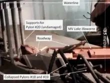 Despite several changes of course, Lake Illawarra proved unmanageable due to having insufficient steerage way. In desperation Pelc ordered 'full speed astern', at which point all control was lost. The vessel drifted towards the bridge midway between the central navigation span and the eastern shore, alliding with the pile capping of piers 18 and 19, bringing three unsupported spans and a 127-metre section of roadway crashing into the river and onto the ship's deck. Lake Illawarra listed to starboard and sank within minutes a short distance to the south, in 35 metres of water. Seven crew members were trapped and drowned. The subsequent Court of Marine Inquiry found that Pelc had not handled the ship in a proper and seamanlike manner, and his certificate was suspended for six months.[2]