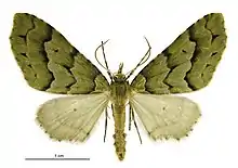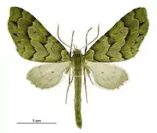 The expansion of the wings is 1+12 inches. The fore-wings are vivid-green; there are four wavy, black, transverse lines; the first near the base, the second a little before the middle, the third considerably beyond the middle, and the fourth near the termen; the subterminal line is very faint towards the tornus, and it emits three or four very sharp, longitudinal, black, tooth-like marks; all the transverse lines are much stronger where they cross the principal veins. The hind-wings are very pale yellowish-green.[7]