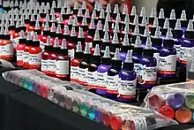 Ancient tattooing practices typically used dark pigments derived from vegetable and animal materials.[15] Alongside the development of more complex technology for tattooing, such as electric tattoo machines, tattoo artists developed inks with pigments derived from colorful minerals, both natural and synthetic.[15] People who continue to practice traditional tattooing methods and styles may make their own pigments or purchase manufactured ink. The history of tattoo ink development is connected to the history of pigment development.