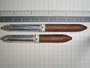There are but two vitolas in this range, both figurados. They are medium-bodied cigars which start out strong, then mellow gradually over the length of the cigar. The band is tri-colored, with red, white and blue stripes, and each cigar is foil wrapped from the head to the midsection, similar to the old Cuban style of foil-wrapped figurados. The numbers in the vitola name is the length in millimeters.