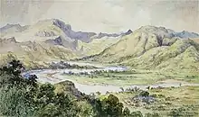 The first European females to visit Nairukuruku and indeed the highlands were writer Constance Gordon-Cumming and Reverend Fredrick Langham's wife Ann Elizabeth, who had accompanied the minister to the Christian enclave village where they spent Christmas in 1875.[35] Ms Gordon-Cumming mused, "indeed we are the first specimens of the race whom they have seen!"[36] During her three-day Christmas stay at Nairukuruku she also captures in her annals, a mass Christian marriage ceremony, a mass native school examination and native life in general that was coming into contact with western civilization. Her water-colour painting of Nairukuruku village and its spectacular surrounds on Christmas Day 1875 is a rare depiction of Viti Levu's eastern highlands landscape.[37]