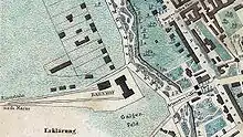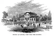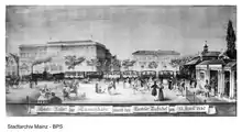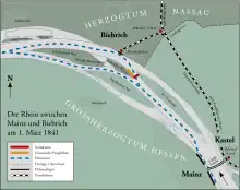 The terminal station of Biebrich (not to be confused with the current Wiesbaden-Biebrich station on the Right Rhine line), later called Rheinbahnhof (Rhine station), lay at the end of a branch line on the Rhine bank in Biebrich. It was particularly important in the early days for rail freight operations and was in the immediate vicinity of the customs office on the Rhine bank.[18] The opening of the link triggered the so-called fog prank (Nebeljungenstreich) in 1841. With this act of sabotage Mainz merchants attempted to block access to the free port of Biebrich to remove the competitive advantage of the railway.