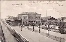 Flörsheim (Main) station (line-kilometre 21.9) serves the town of Flörsheim am Main. The main entrance building, although rebuilt several times, dates from the first year of the line, 1839.