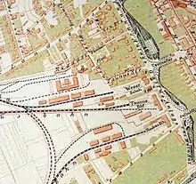 On 3 August 1840 a 1.5 kilometre-long branch line was opened to Biebrich, which was operated by horse-drawn traffic until 14 May 1872.[18] The line was shortened in 1908 and the station was relocated accordingly. From then on, the line was only used for freight traffic, as travellers to Wiesbaden, who arrived by ship, could be transported by the Wiesbaden steam tramway, operated by the South German Railway Company (Süddeutsche Eisenbahn-Gesellschaft, SEG) from 1889. The branch still exists today as an industrial siding from the Kalle-Albert industrial park.