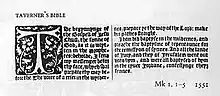The successful sale of Matthew's Bible, the private venture of the two printers Grafton and Whitchurch, was threatened by a rival edition published in 1539 in folio (Herbert #45) by "John Byddell for Thomas Barthlet" with Richard Taverner as editor. This was, in fact, what would now be called "piracy," being Grafton's Matthew Bible revised by Taverner, a learned member of the Inner Temple and famous Greek scholar. He made many alterations in the Matthew Bible, characterized by critical acumen and a happy choice of strong and idiomatic expressions.[1]