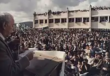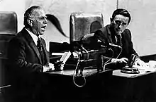 Toubi raised the issue of the right of return for Palestinian refugees on at least two occasions in the Knesset. After the 1948 Arab-Israeli War, he demanded that the inhabitants of al-Birwa be allowed to return to their homes, a request refused by David Ben-Gurion.[10] After the 1967 war, he requested from Moshe Dayan that the inhabitants of Yalo be allowed to return to their homes, but it too was denied.[11] In 2012, the discourses and articles of Tawfik Toubi were published in Israel by his wife Olga and his son Elias. Tawfik Toubi is accepted, honored and rewarded by the Israeli establishment.[12]