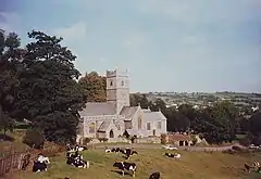 A Grade I listed building, St Peter's church is, unusually for Devon, a church largely of the 14th century. A church existed on this location circa the 12th century, but was extensively modified and enlarged. According to the listing summary, "the crossing tower, north and south transepts and aisles were added" in the 14th century; additional modifications were made in the next two centuries before a restoration in 1867-1868.[4]