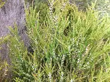 The shrub has an erect form and typically grows to a height of 3 to 4 metres (10 to 13 ft). It blooms between July and October producing white flowers.[2] It can be grown as an ornamental shrub in the garden where it is hardy and has dense foliage. The small white flowers grow in masses and the foliage is aromatic. The shrub is drought tolerant once established and will also tolerate light frosts.[1]