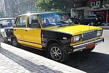 In Egypt, taxi liveries vary by governorate. The most iconic Egyptian taxis are those of Cairo (navy blue and white) and Alexandria (yellow and black), although a new Cairo livery (white with a black-and-white checkered stripe along the centre) has arisen in recent years, indicating those taxis with working meters.